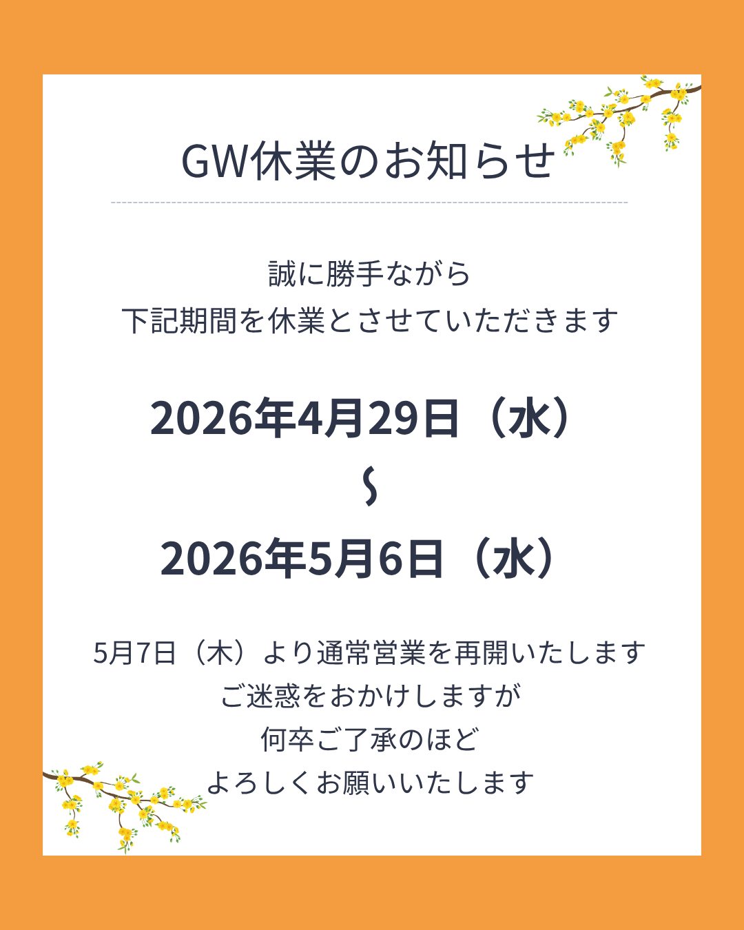 ゴールデンウィーク休業のお知らせ 2026年4月13日 平素よりご愛顧いただき、誠にありがとうございます。 誠に勝手ながら、下記の期間をゴールデンウィーク休業とさせていただきます。 休業期間:2026年4月29日(水)〜2026年5月6日(水) 5月7日(木)より通常営業を再開いたします。 休業期間中にいただいたお問い合わせにつきましては、 営業再開後に順次対応させていただきます。 ご不便をおかけしますが、何卒よろしくお願いいたします。